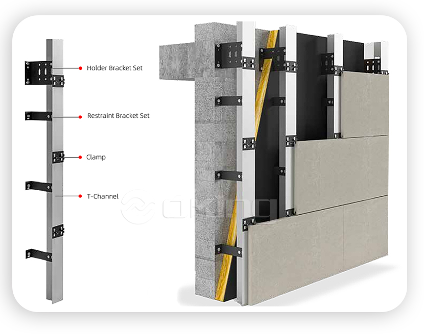 ●Ovaj ventilirani fasadni sustav probija snagom jer nudi rješenja za brzu instalaciju i fleksibilnost u rješavanju pojedinačnih točaka. Ima okomite profile i različite kopče koje omogućuju da se komad učvrsti na različite načine, zadovoljavajući sve potrebe koje se mogu pojaviti tijekom montaže.