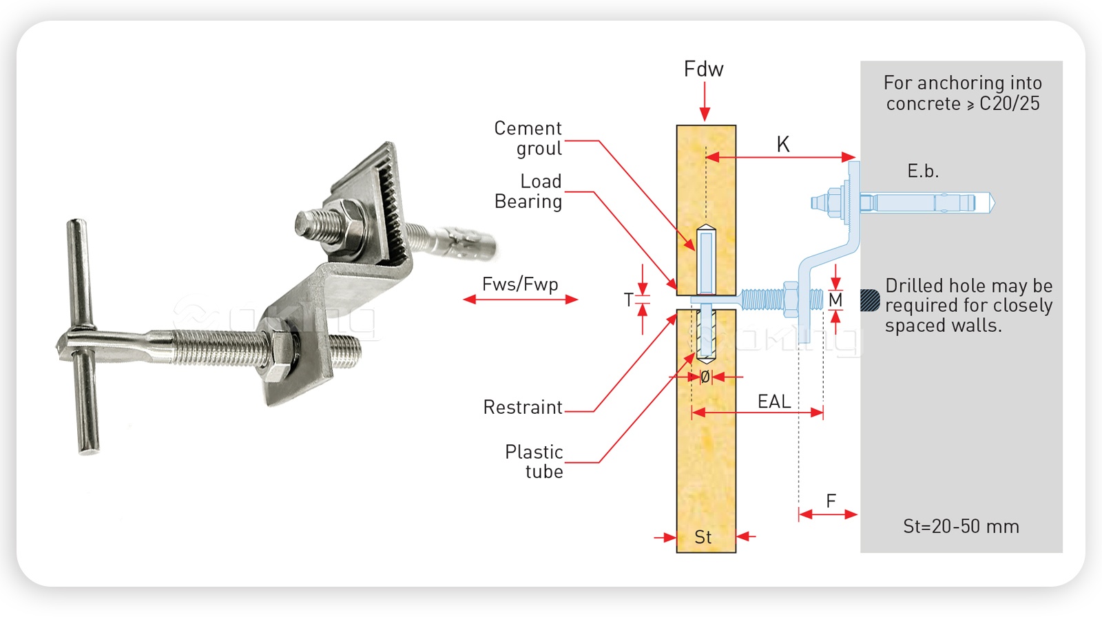 | K (mm) | K - (mm) | K (mm) | Fdw (N) | F (mm) | Fwp (N) | Fws (N) | E.b.(mm) | f (mm) | M (mm) | T (mm) | EAL (mm) | |